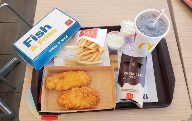 Here is a picture of the food. The meal comes with 2 fish, 1 small fries, 1 small drink and 1 chocolate pie. The meal cost $9. Overall, I guess this is a meal that you will only try once and never again. The meal taste average and slightly “long John silver”-ish.