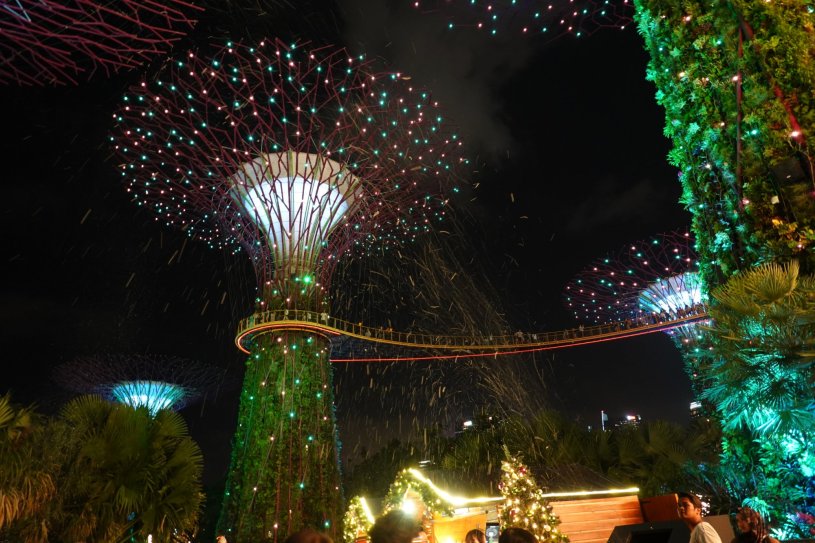 The highlight for the event is a rhapsody with the garden by the bay trees. However, I find it underwhelming than the normal lighting. It was followed by a “snow” time after the light show. This year, the “snow” happens outdoor. The snow is in the picture.
