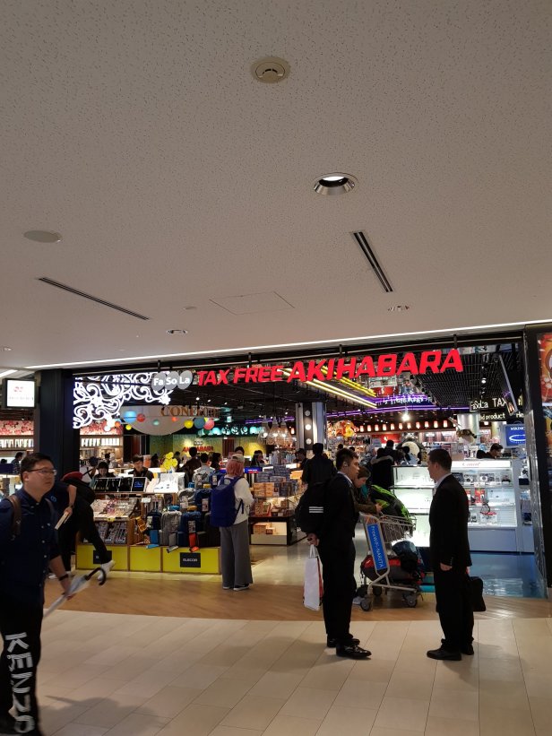 Turns out there is a “Tax Free” Akihabara in the airport. We spend some of our remaining cash on the food that we might eat over here.