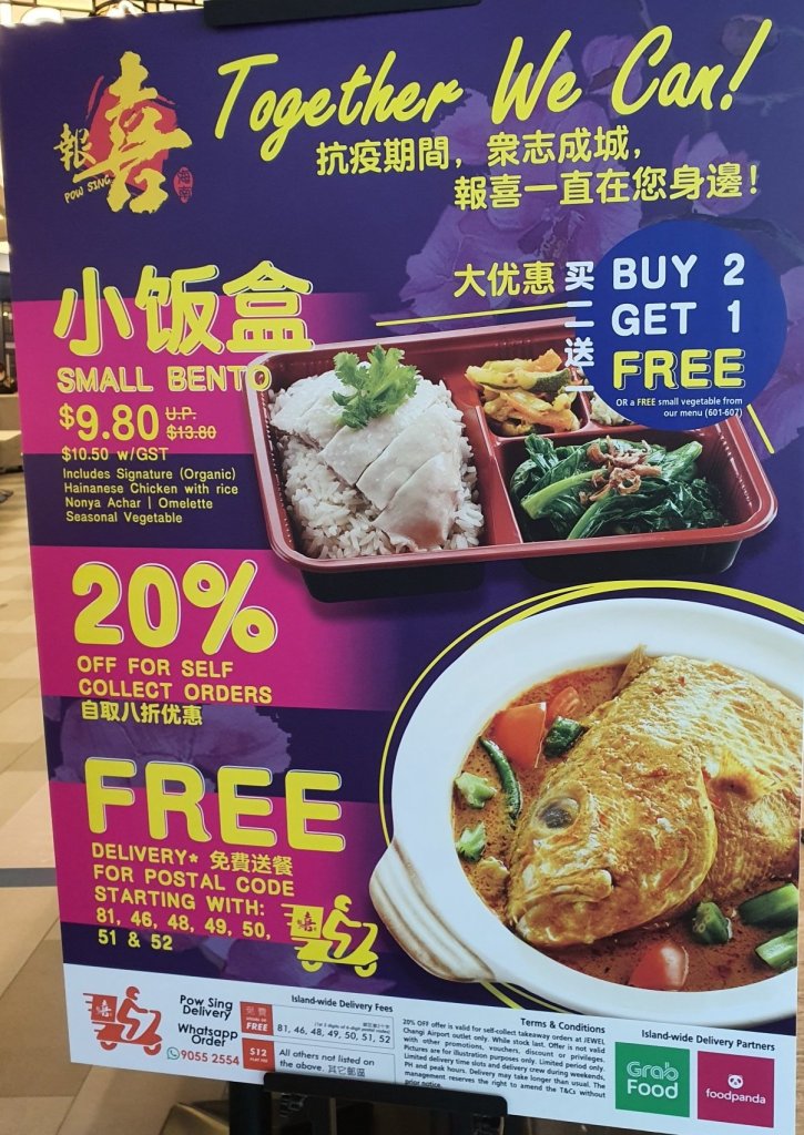 Many shops offer takeaway and some every have discounts. Eg, A1 has 30% off all menus and a few restaurants sells bento set.