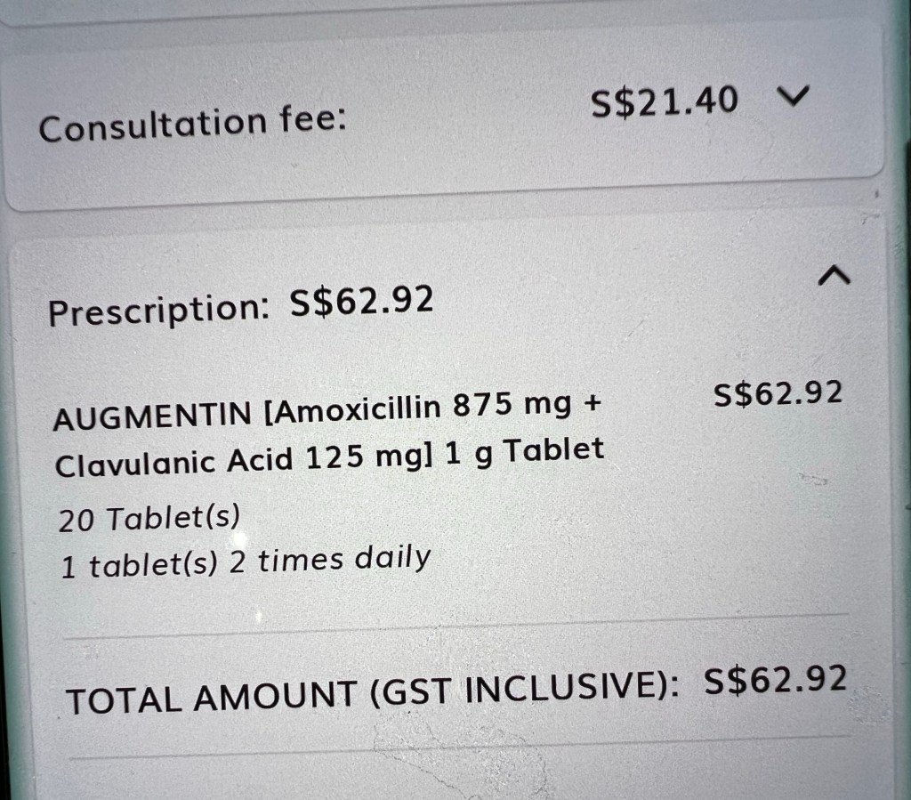 In total, we paid approximately $21 for the consultation and $62 for the medicine. the consultation was rather cheap but the medicine seemed slightly expense. My wife received 10 days worth of Augmentin, to be taken twice a day.