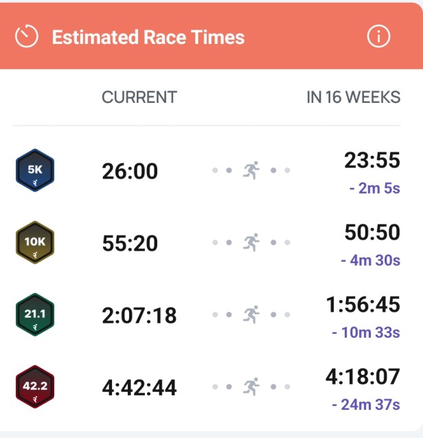 As a guy, I suppose I would want to not just complete it, but run under a suitable target. I’m hoping it will be under 2hour as it seemed that many people who doesnt train can run under around 2 hour 30 min in the recent Tik Toks that I have seen for 2XU run. (Although that race is short of 1.1km). Based on my latest 5km run, Runna estimate 2.07 hour. My latest 10km similar to Runna’s estimation, so the predictor looks accurate. Runna also suggest that i can aim for 1:56 hr for my half marathon.